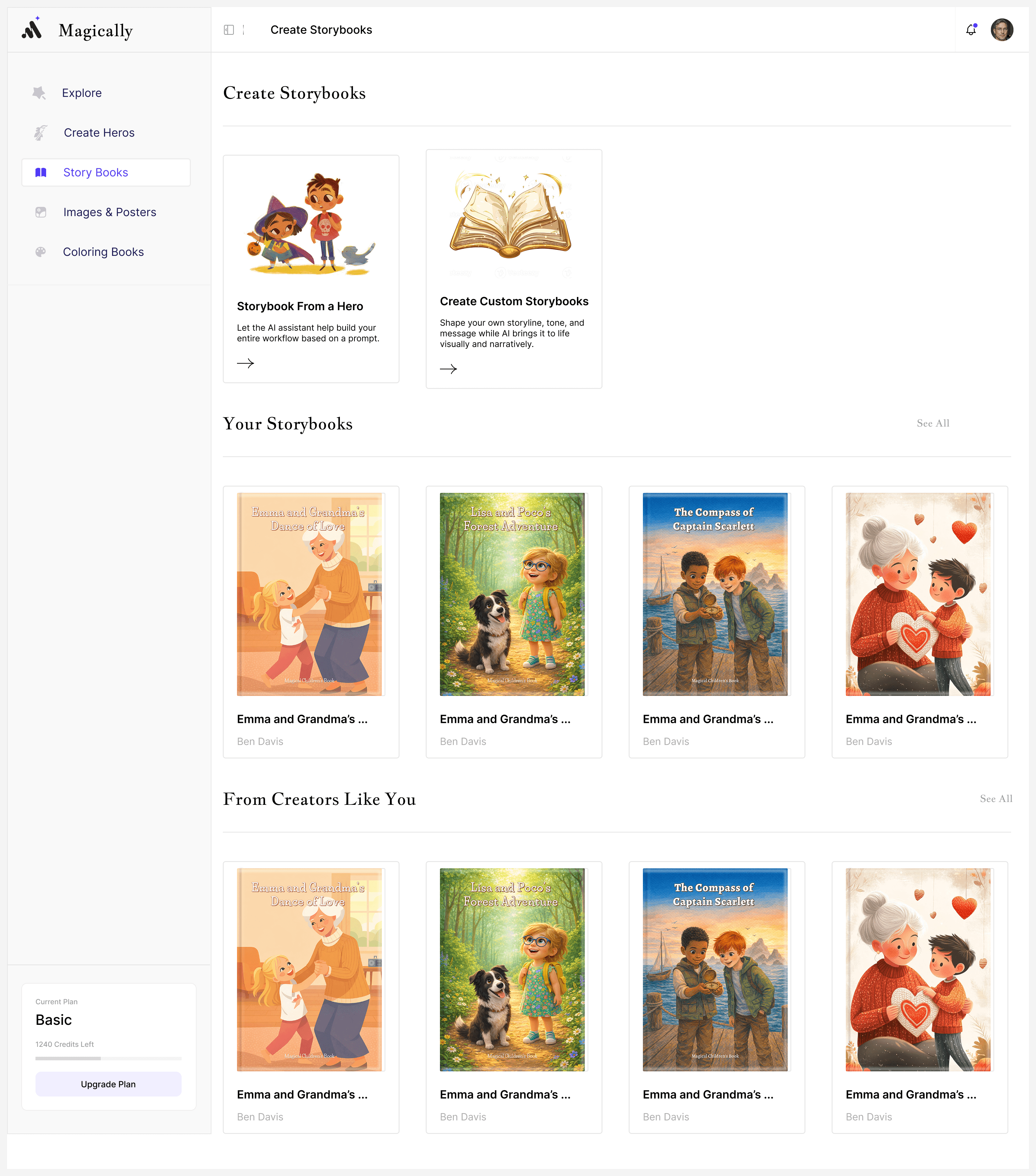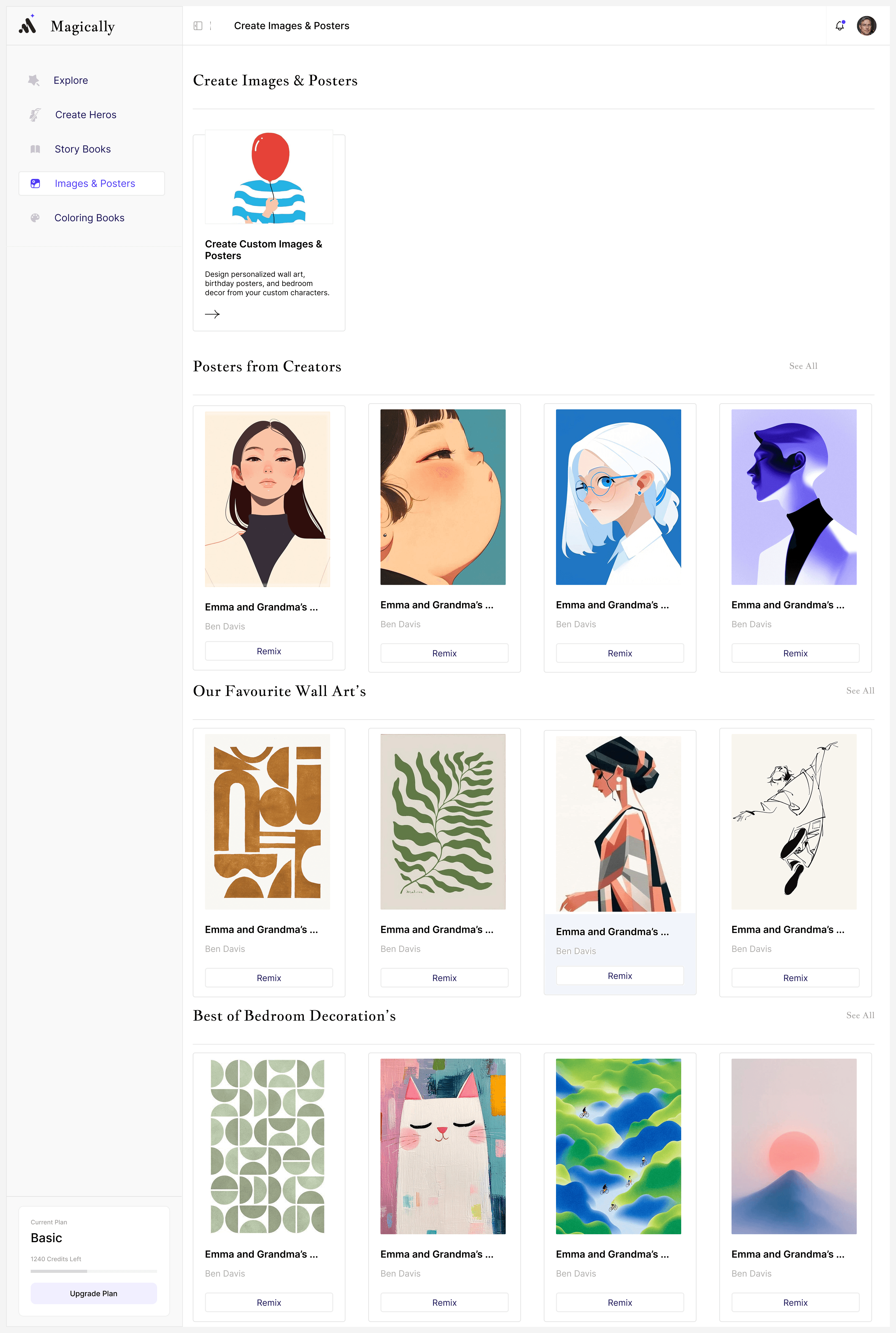 Each category provides curated starting points with references and remix options, helping users create confidently instead of facing blank prompts, Beyond storybooks, Magically supports: