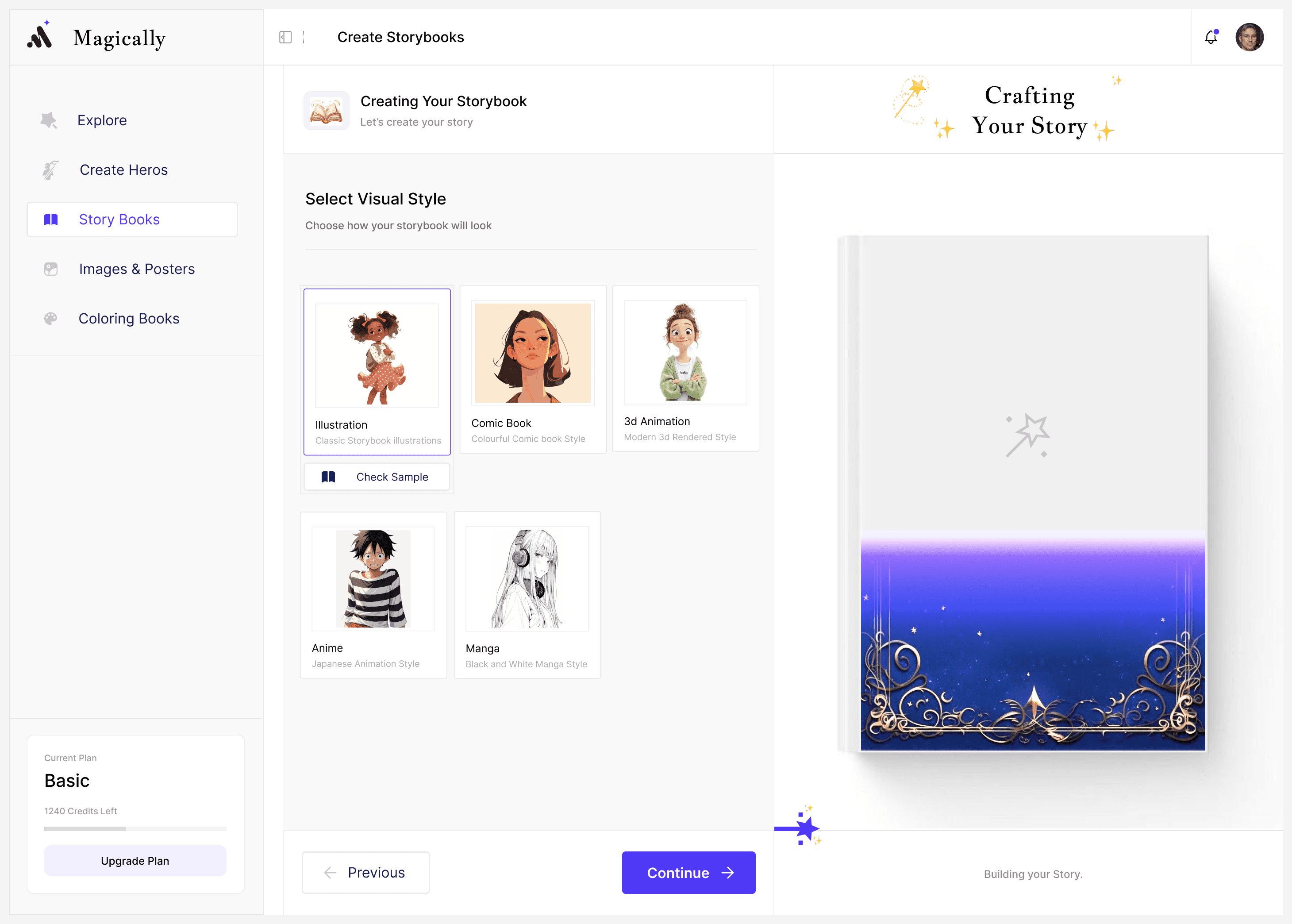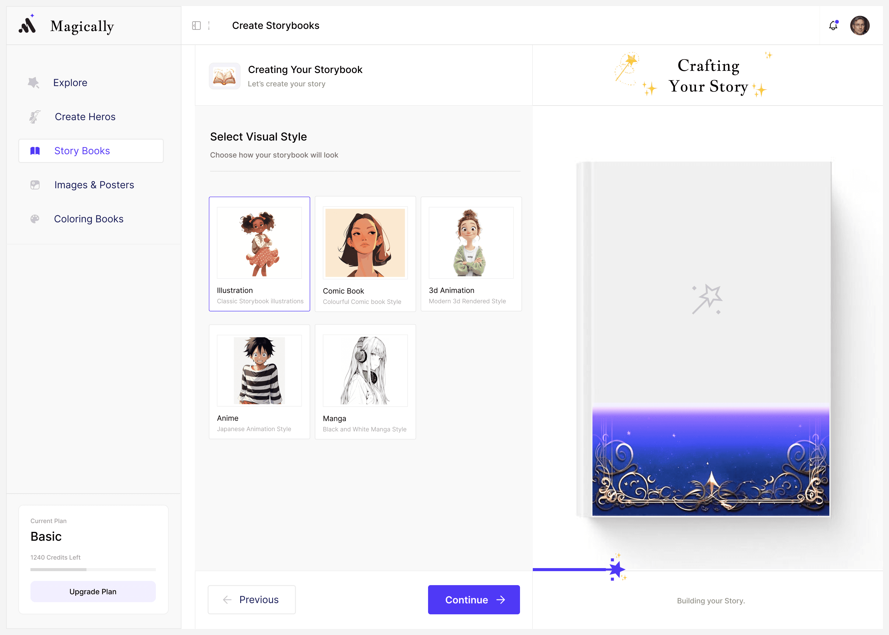 Choose story style (3D, illustration, anime, comic)