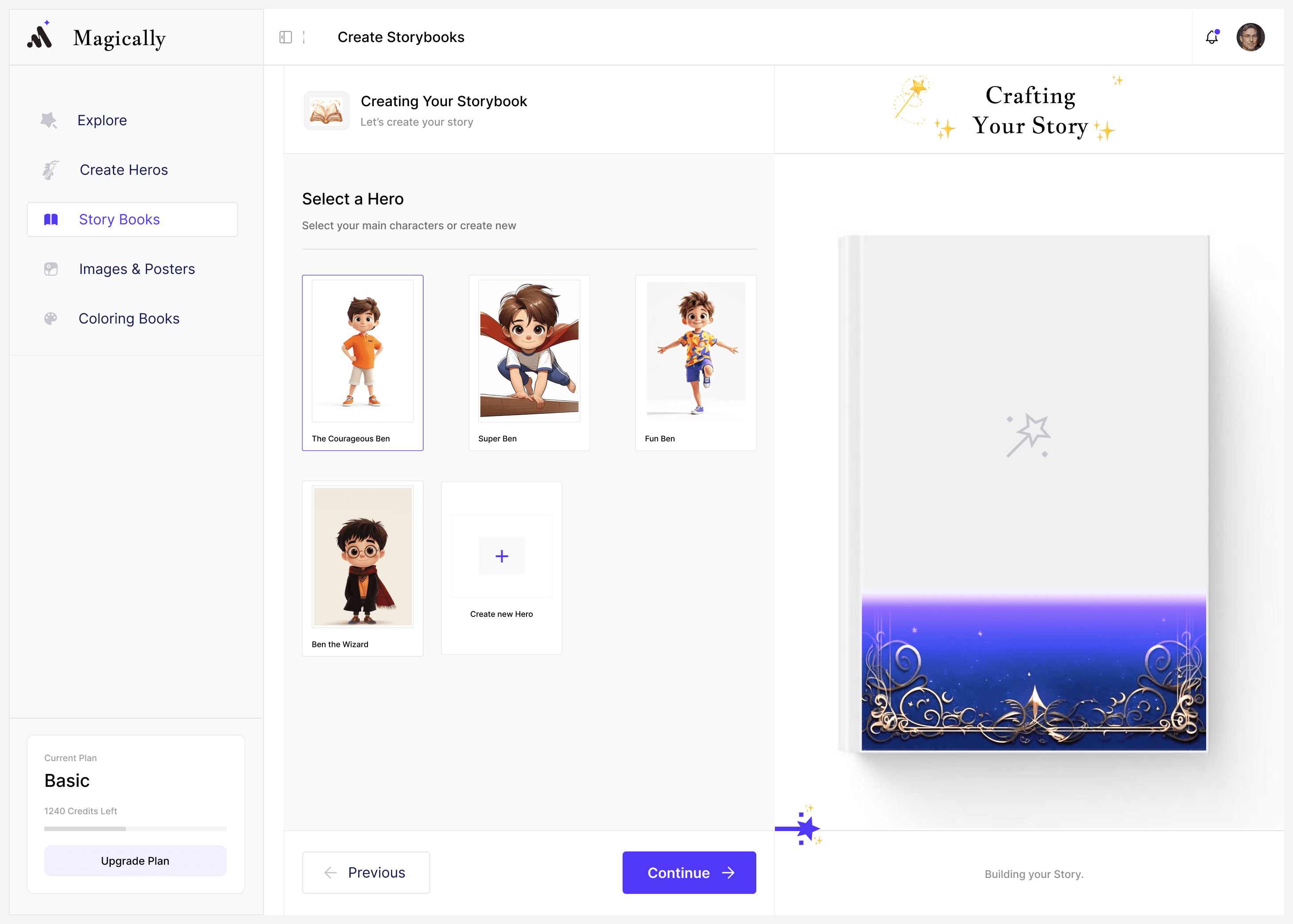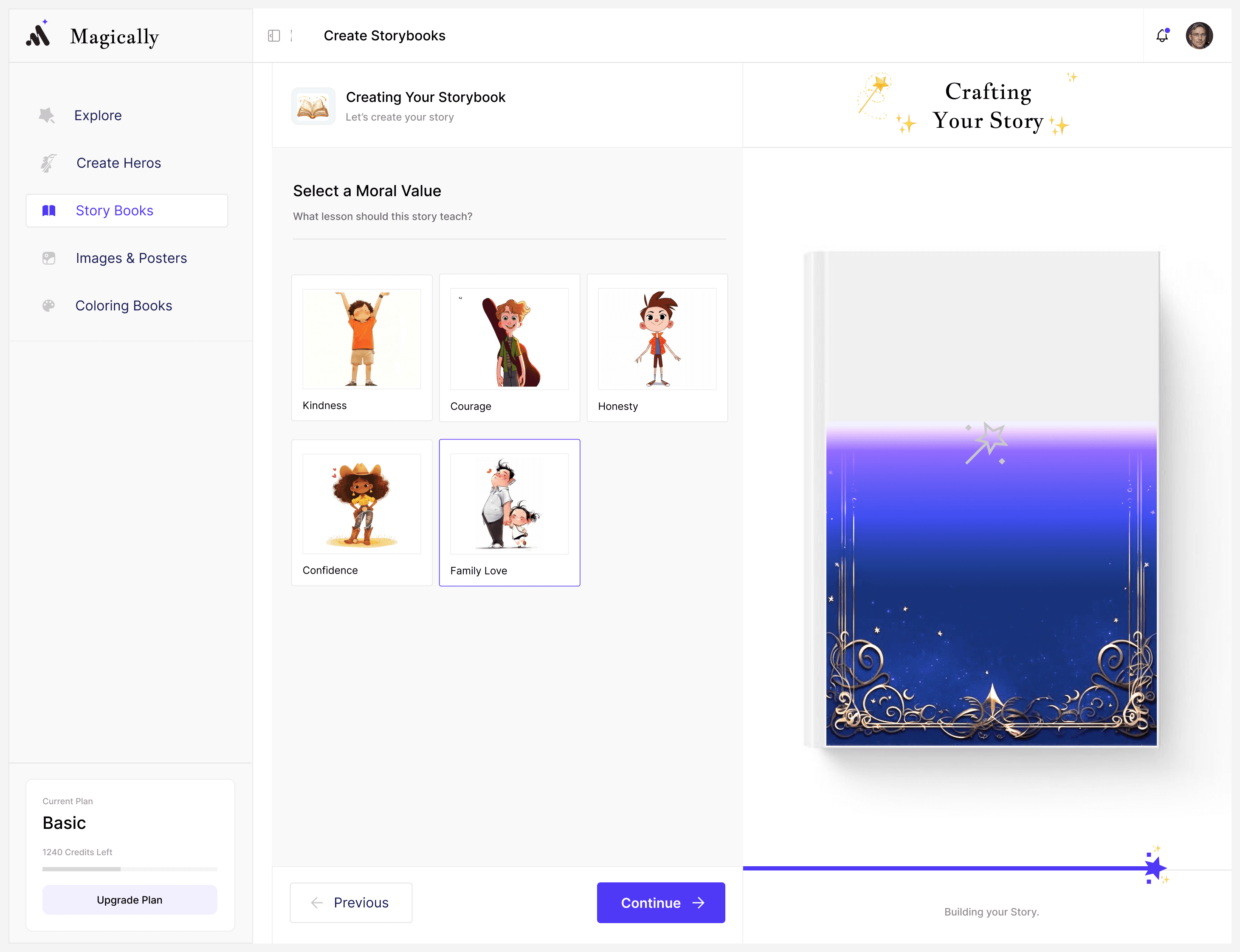 Storybook creation follows a guided wizard designed for parents: