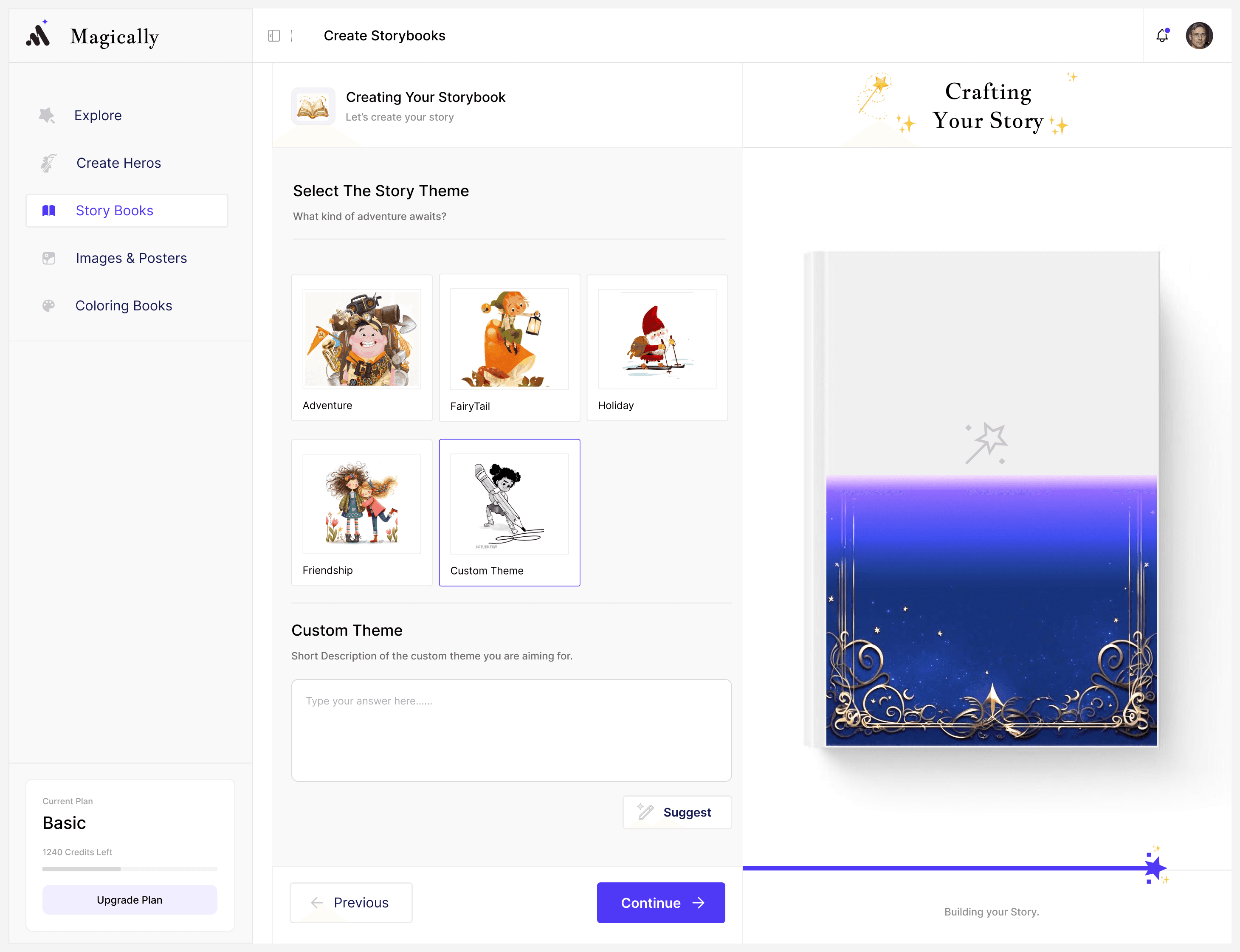 Delivered a fully structured AI storytelling platform covering character creation, story generation, creative outputs, and physical print fulfillment within a single unified system.Prompt-Free Guided Creation Model